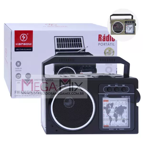 Rádio Portátil Recarregável Bluetooth com Placa Solar AM/FM/SW/USB KA-8818 H - Kapbom